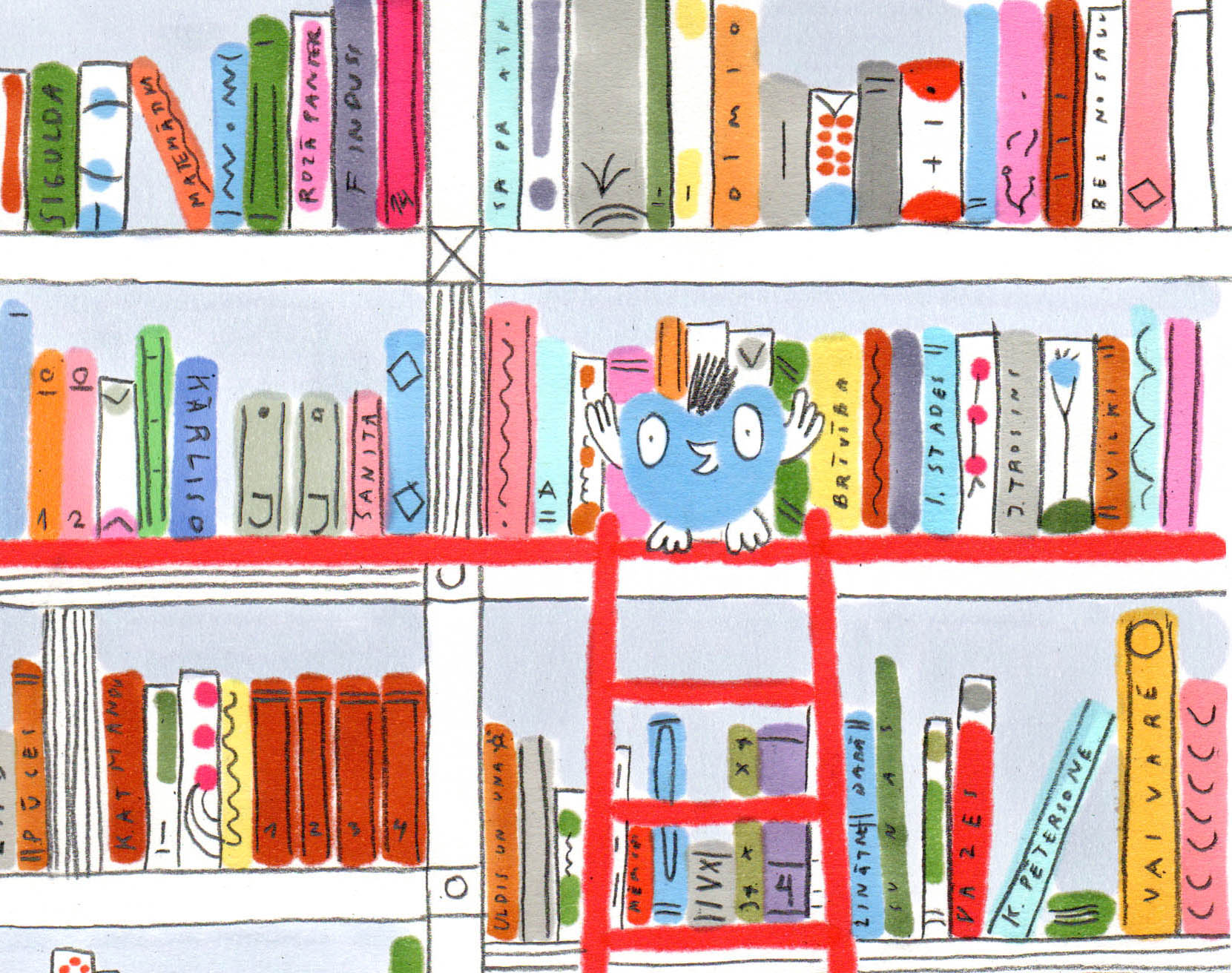 Māksliniece Rūta Briede: “Mūsu bērnu izdevuma “Vai grāmatai ir knābis?” varonis Elmārs atrod grāmatu pilnu ar burtu skudriņām! Tās, šoreiz īstas, paslēpušās arī izstādes stendos un gaida, kad tiks sameklētas. Ja vēl neproti lasīt burtu skudras, nāc uz izstādi un sameklē īstās!”